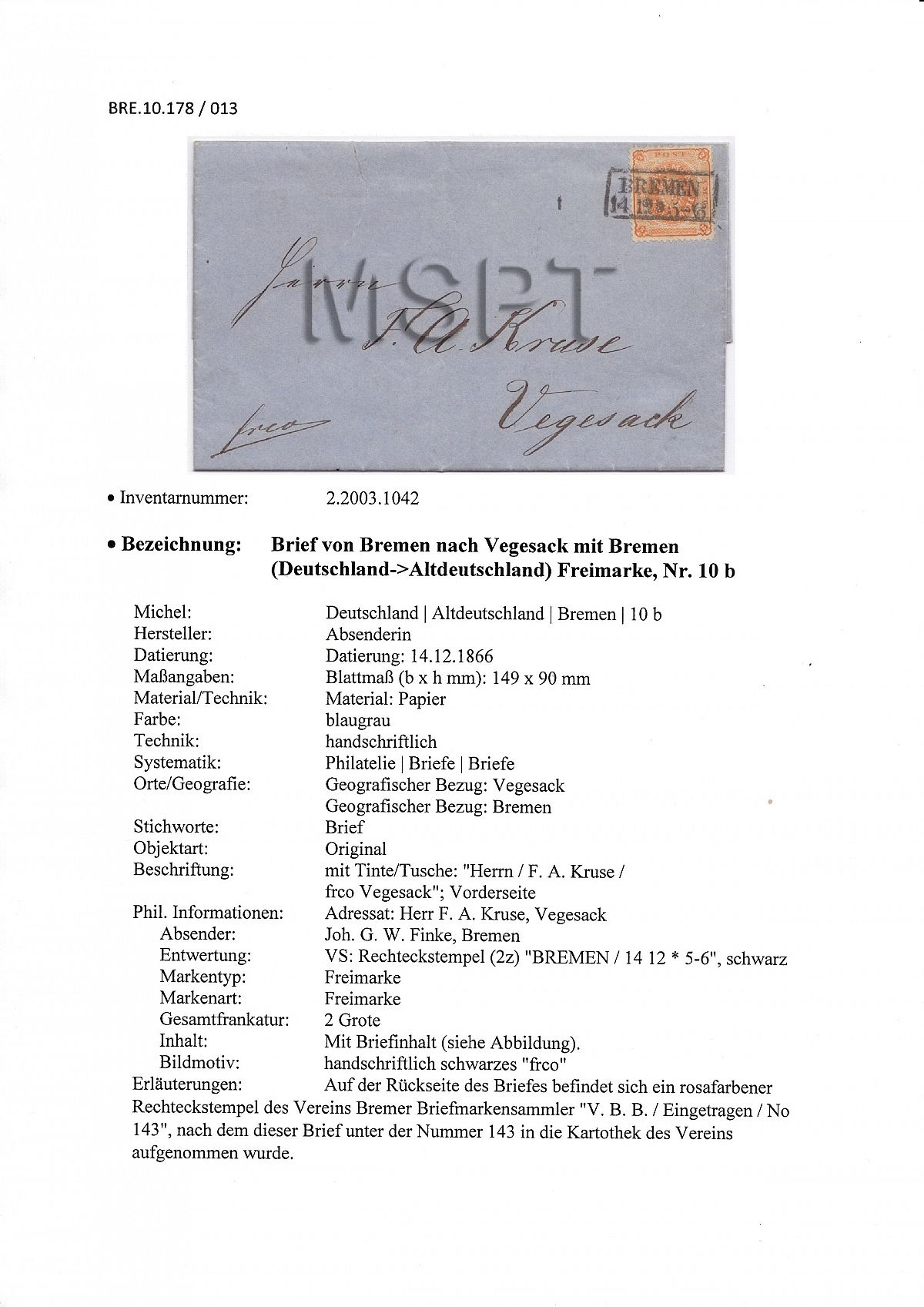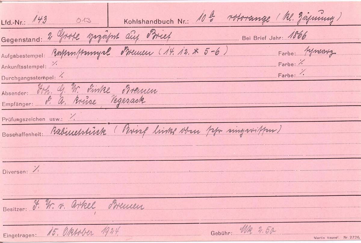 Nun haben wir uns entschlossen, die Rubrik "Auktionen/Provenienzen" ab sofort nur noch gegen eine Aufwandsentschädigung sichtbar zu machen. Ein persönlicher Zugang kann für EUR 30,- pro Kalenderjahr unter info@bremen-archiv.de angefordert werden.
