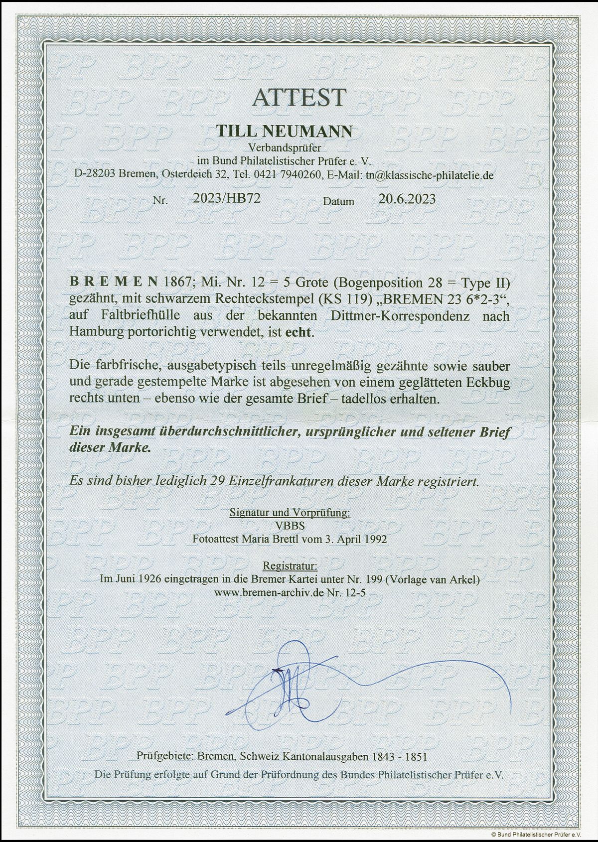 Nun haben wir uns entschlossen, die Rubrik "Auktionen/Provenienzen" ab sofort nur noch gegen eine Aufwandsentschädigung sichtbar zu machen. Ein persönlicher Zugang kann für EUR 30,- pro Kalenderjahr unter info@bremen-archiv.de angefordert werden.