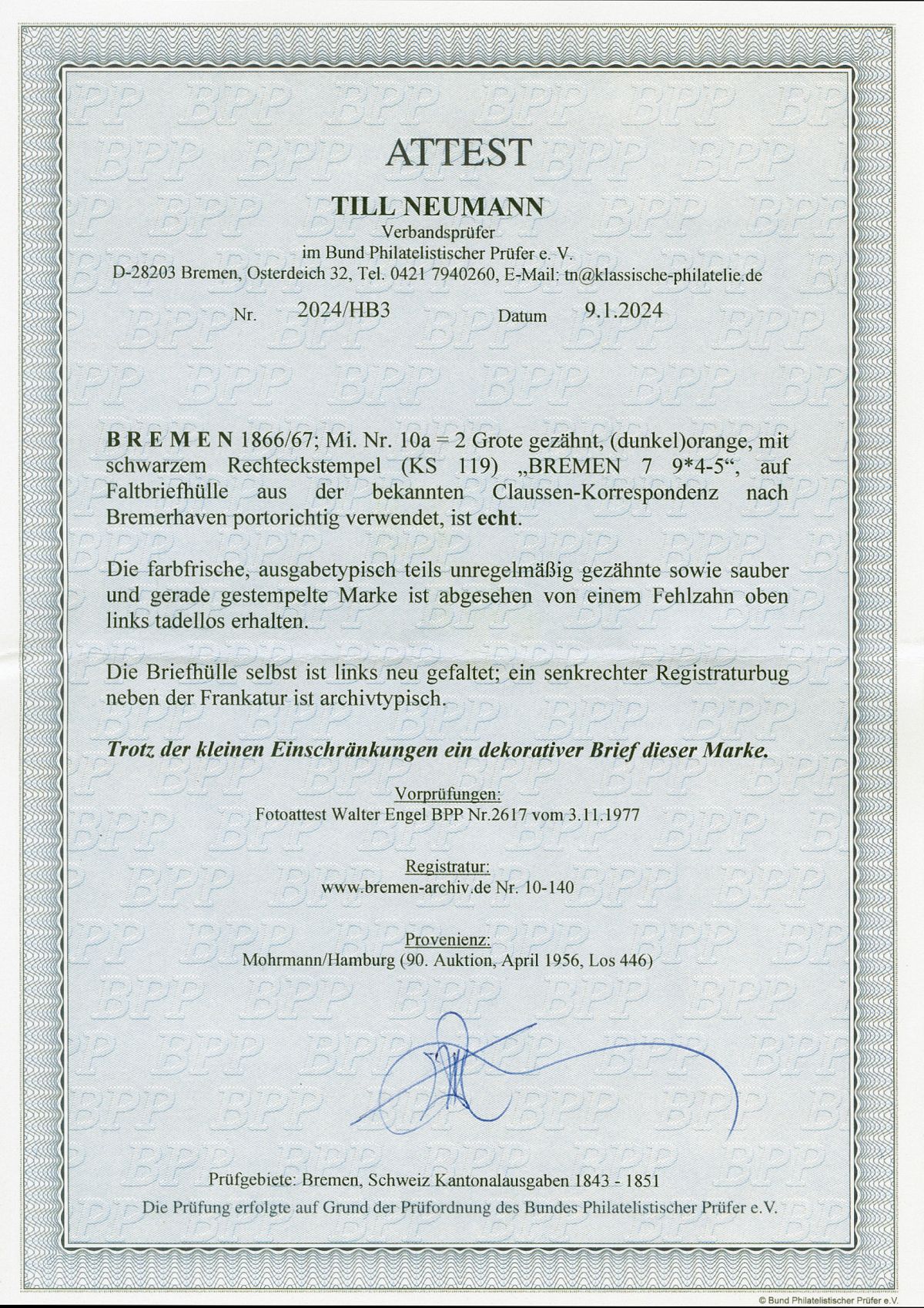 Nun haben wir uns entschlossen, die Rubrik "Auktionen/Provenienzen" ab sofort nur noch gegen eine Aufwandsentschädigung sichtbar zu machen. Ein persönlicher Zugang kann für EUR 30,- pro Kalenderjahr unter info@bremen-archiv.de angefordert werden.