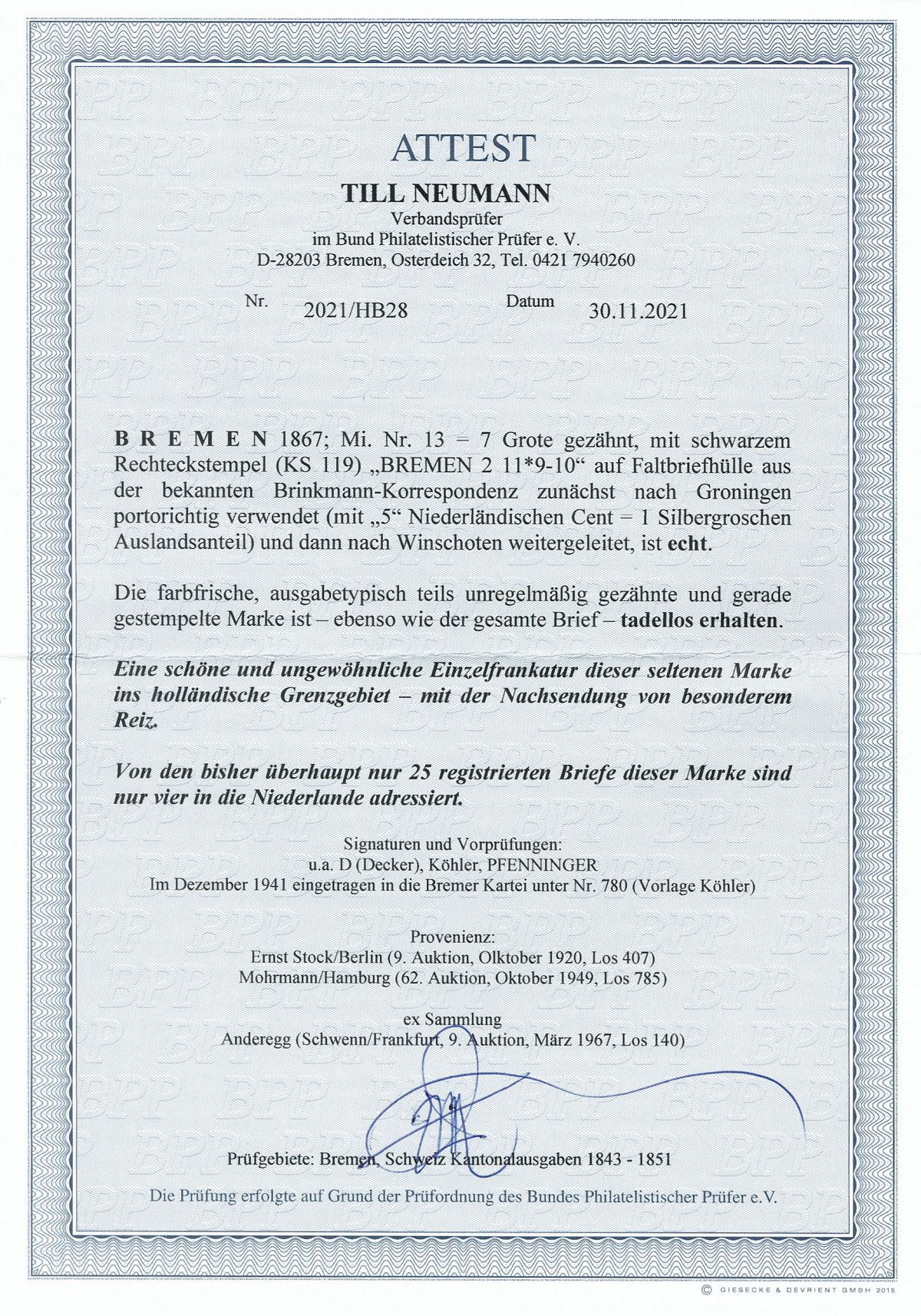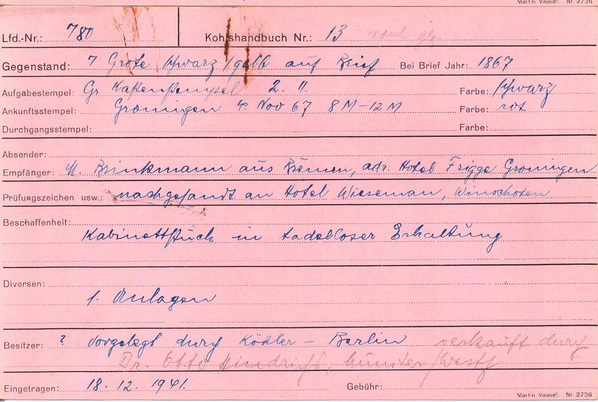 Nun haben wir uns entschlossen, die Rubrik "Auktionen/Provenienzen" ab sofort nur noch gegen eine Aufwandsentschädigung sichtbar zu machen. Ein persönlicher Zugang kann für EUR 30,- pro Kalenderjahr unter info@bremen-archiv.de angefordert werden.